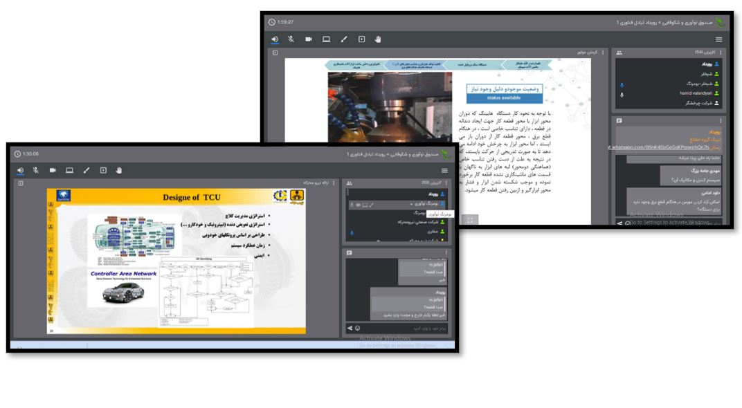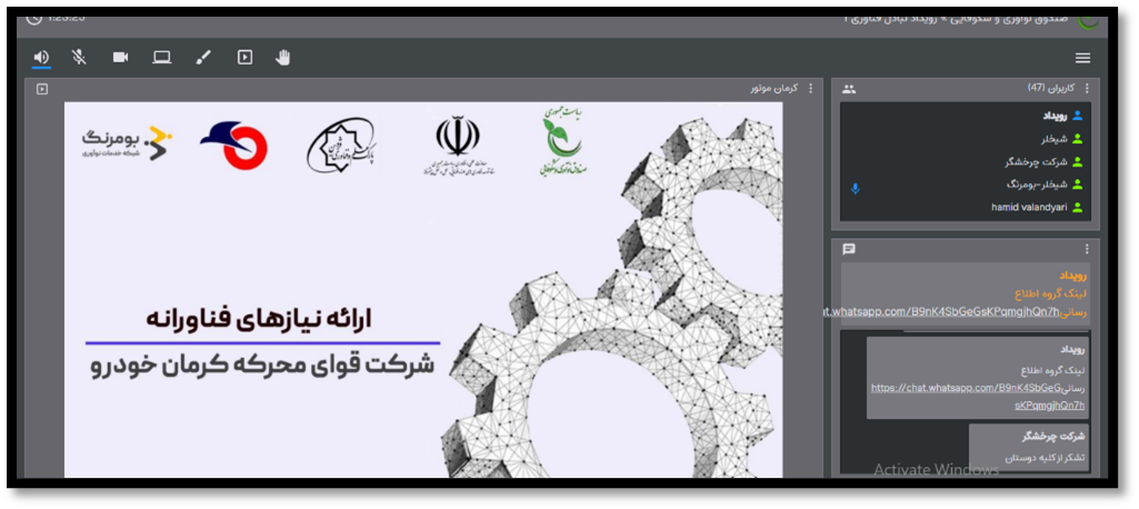 با هدف معرفی نیازهای فناورانه شرکت چرخشگر، شرکت قوای محرکه کرمان خودرو، گروه صنعتی نیرو محرکه 3 وبینار مجزا طی 2 روز برگزار شد و نمایندگان این سازمان ها نیازهای خود را برای مخاطبان تشریح نمودند. در مجموع بیش از 50 مخاطب آنلاین در این وبینارها مشارکت نموده و سوالات خود را مطرح کردند که نمایندگان سازمان ها پاسخ سوالات را ارائه نمودند.